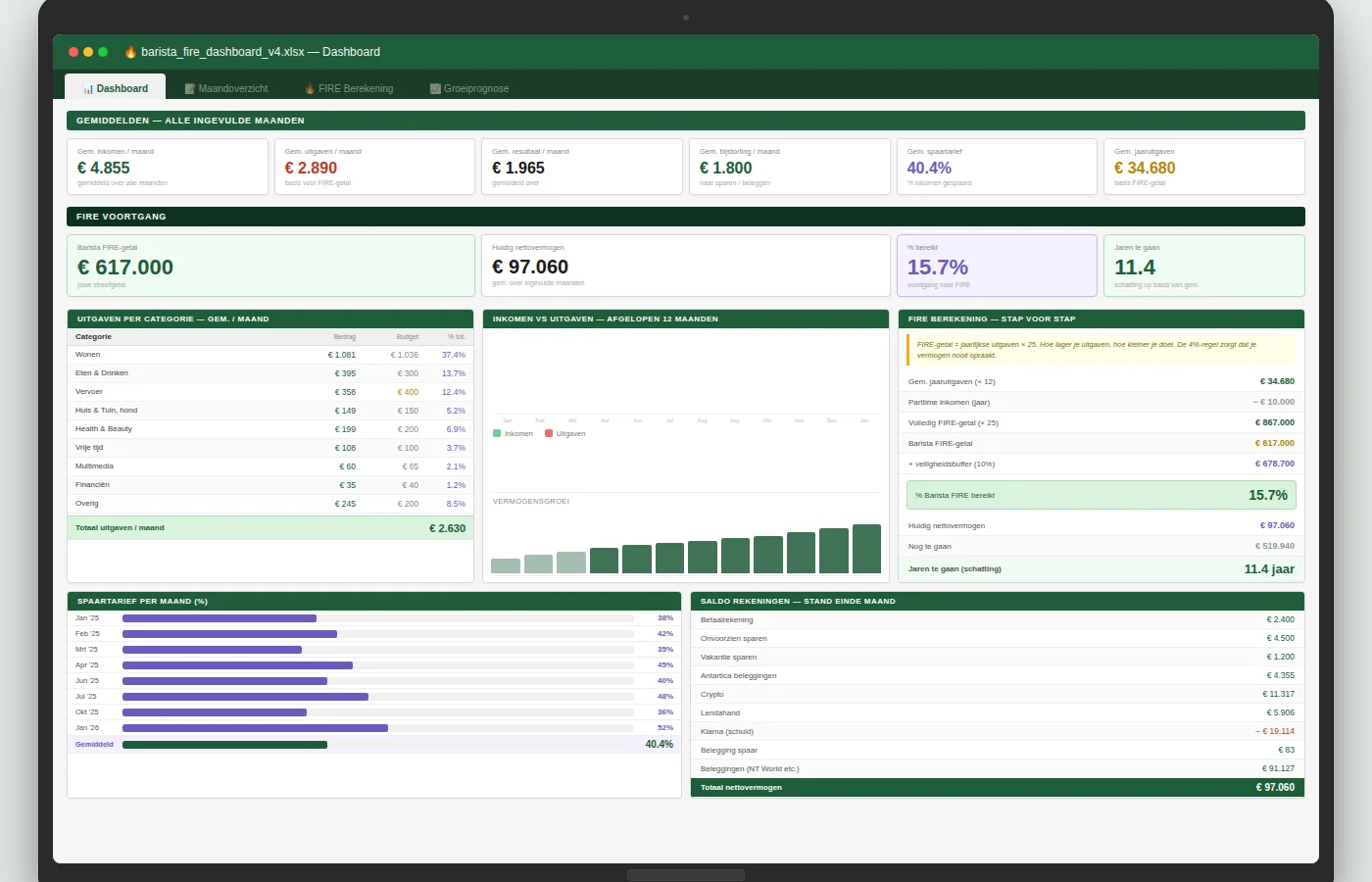 Het Barista FIRE Dashboard is een Excel-bestand met vier tabbladen die samen één systeem vormen: